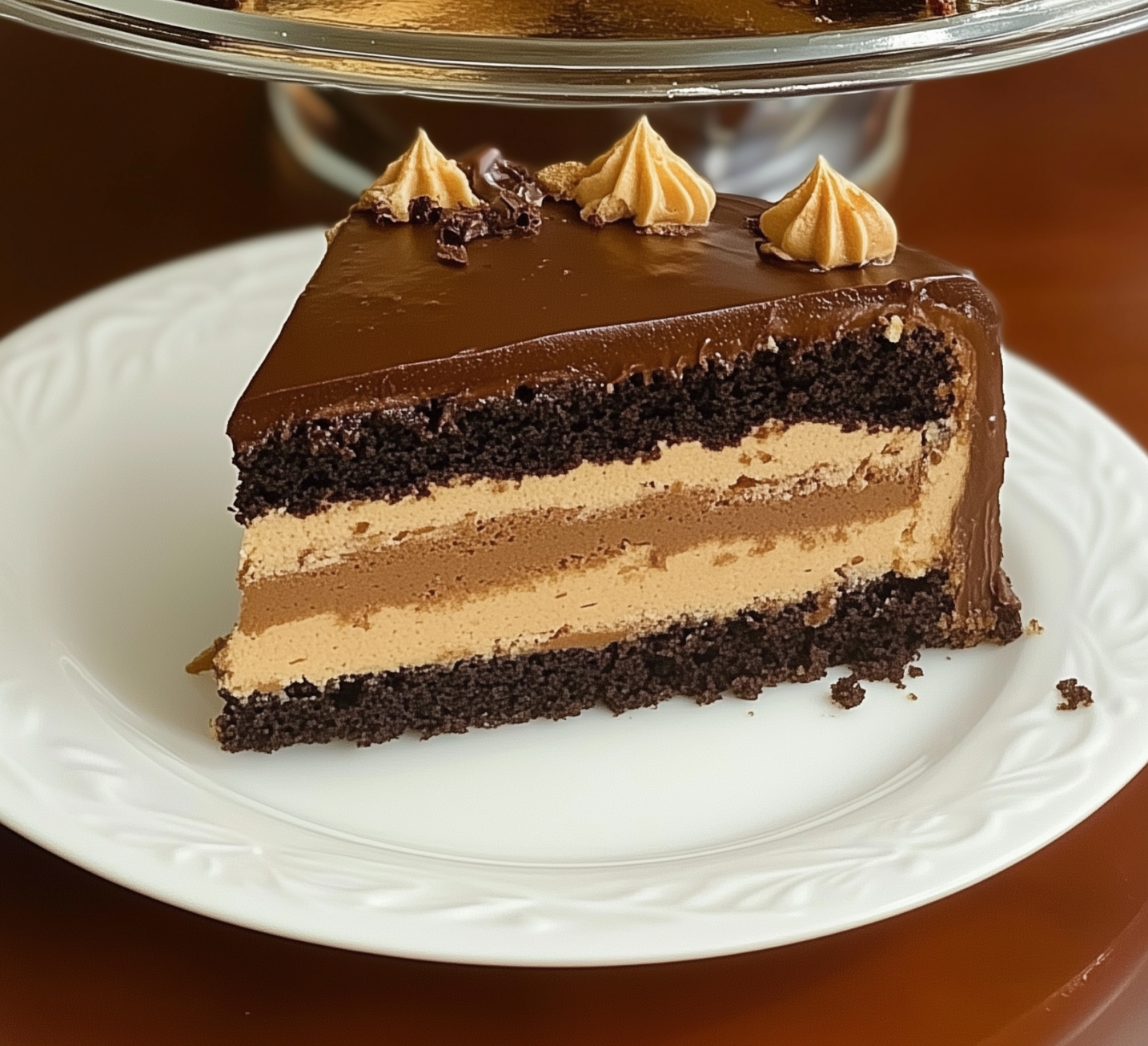 stacked chocolate cake layers with Biscoff cookie butter frosting and chocolate ganache on a rustic wooden table